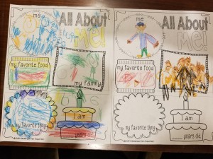 Here are some pictures of representative work from large group sessions, supposedly mostly independent work. I have been told Savanna gets a lot of attention in these situations (and Austin gets almost none, his work is on the right side in each picture).