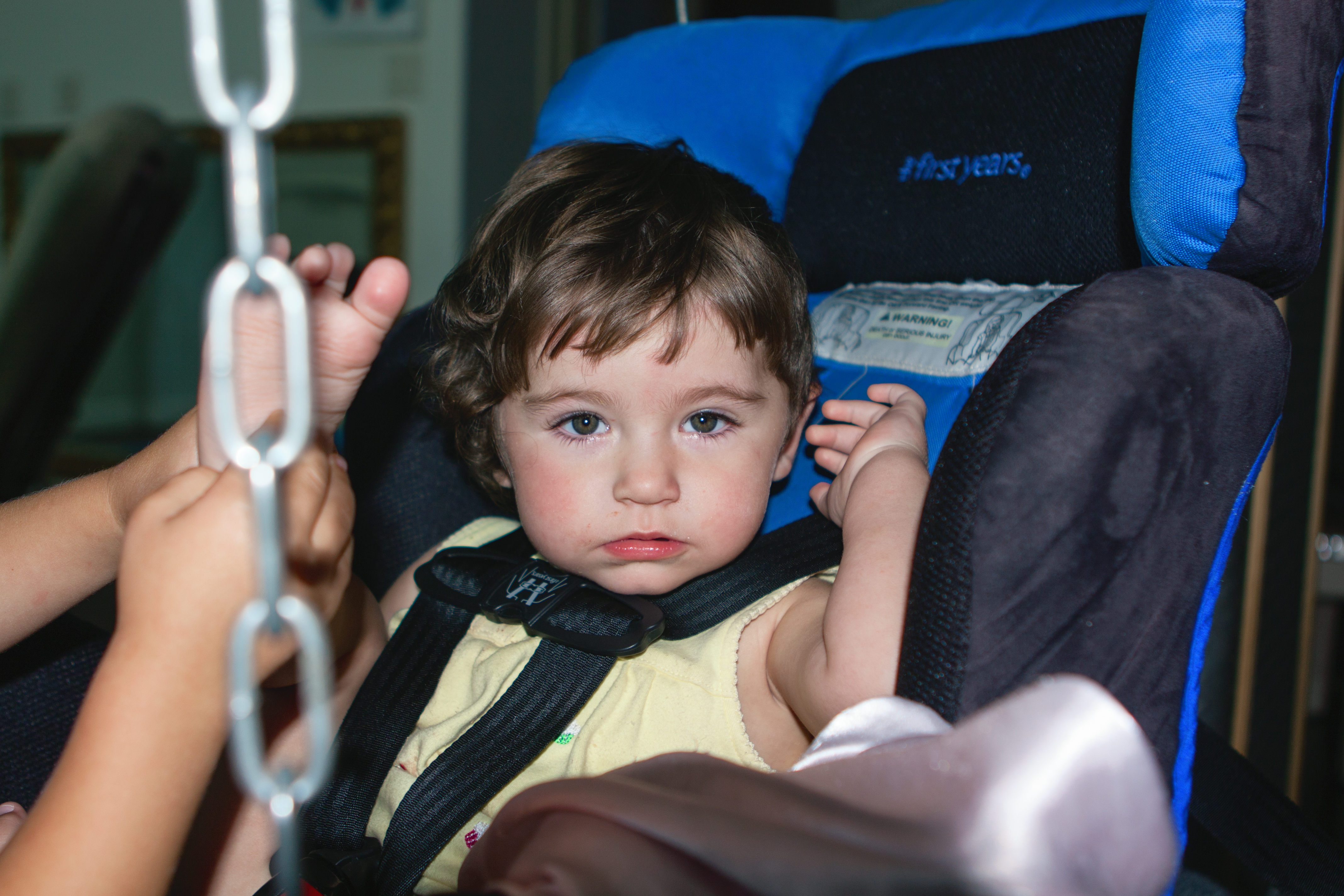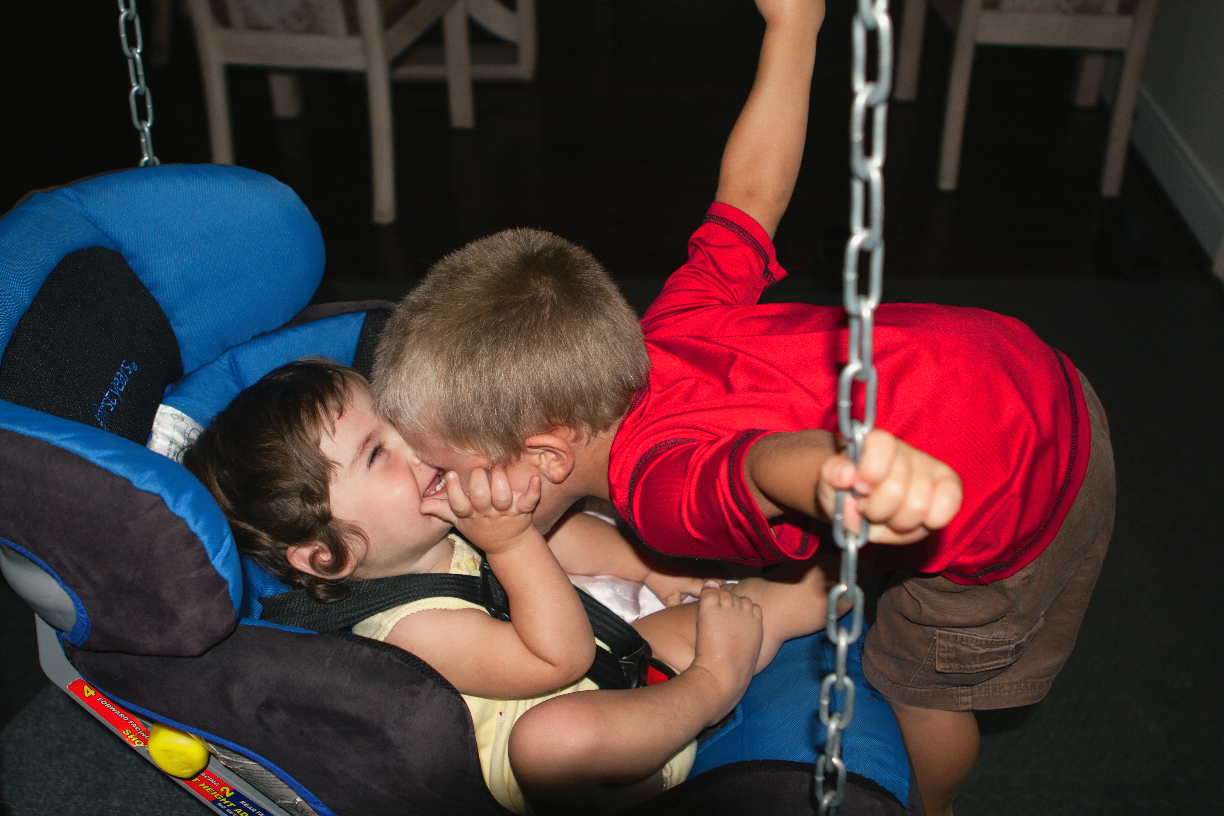 Here is a video clip of her swinging. A few months ago, she could barely push the swing around and still hang on. She is a bit tired here, but manages quite well. Important to note is that she understands to get near the center of the platform to reduce the centrifugal force from spinning. It is there she can comfortably sit and eat, or whatever (notice the chips sitting in the center). She loves her swing!