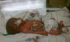 In April 2012, Superman had to have laser surgery done on both eyes for a condition called Retinopathy of Prematurity (ROP). Left untreated, in many cases it will progress and cause permanent blindness. Due to the mass amounts of oxygen used, it causes the blood vessels in the eye to basically sprout off and create new ones, overloading the retina with blood vessels that have no purpose. Although his eyes were fixed (and are still perfect over a year later) he now has what is called Cortical Vision Impairment or CVI where the brain doesn’t always register what it is seeing. Because of this condition he has been diagnosed as legally blind.